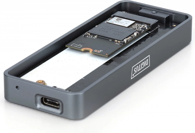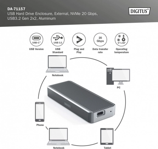 Compacte aluminium behuizing voor M.2 NVMe-SSD met USB 3.2 Gen 2x2-interface, biedt overdrachtsnelheden tot 20 Gb/s, eenvoudige gereedschapsloze installatie en brede compatibiliteit. Ondersteunt formaten 2230/2242/2260/2280, capaciteit tot 8 TB en zorgt dankzij passieve koeling voor betrouwbare prestaties op Windows, macOS, Linux en ChromeOS.