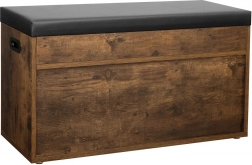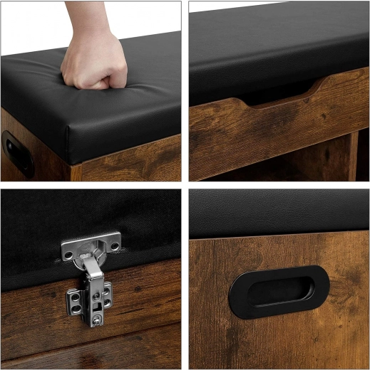 Houten schoenenbank in loftstijl biedt moderne looks en functionaliteit in één. Gemaakt van spaanplaat, voorzien van een zacht, zwart kussen bovenop dat gemakkelijk kan worden verwijderd dankzij klittenband. Onder het kussen bevindt zich voldoende opbergruimte voor pantoffels of kleine kledingstukken zoals hoeden, sjaals of handschoenen.