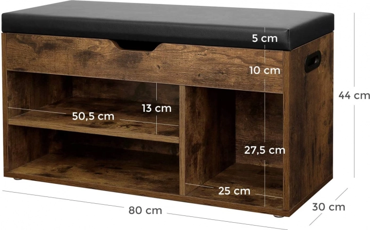 De bank is uitgerust met drie planken - twee brede planken (50,5x13 cm), één smalle plank (25x27,5 cm) en extra ruimte onder de zitting (80x30 cm). De moderne loftstijl voegt flair toe aan het interieur.