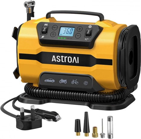 De AstroAI is een compacte en krachtige compressor voor dagelijks gebruik. De metalen cilinder en dubbele motor zorgen voor een lange levensduur en stabiele prestaties, terwijl realtime digitale drukmeting en automatische uitschakeling beschermen tegen overoppompen. Flexibele voeding via 12V uit de autoaansluiting of 110–240V uit het stopcontact maakt hem perfect voor thuis en onderweg.