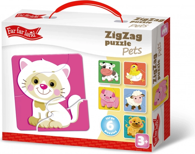 Puzzel ZigZag Huisdiertjes van Far Far Land is een speelgoedpuzzel voor kinderen vanaf 3 jaar en biedt plezier met huisdieren in 6 verschillende afbeeldingen. Kleurrijke ontwerpen en een speciaal zigzag-snijpatroon verrijken de speelervaring.
