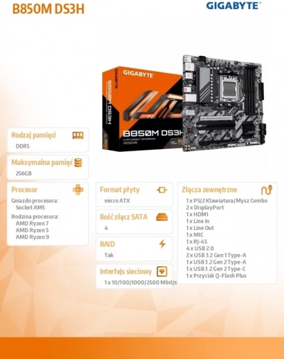 Het GIGABYTE B850M DS3H moederbord voor AMD AM5 biedt eenvoudig meer gameprestaties dankzij de X3D Turbo-modus met één klik, ondersteuning voor Ryzen 9000/8000/7000 processors, dual-channel DDR5, ultrasnelle opslag met M.2 PCIe 5.0 en 2.5 GbE netwerk – dit alles in een praktisch ontwerp met slimme EZ-Latch vergrendelingen voor schroefloze installatie.