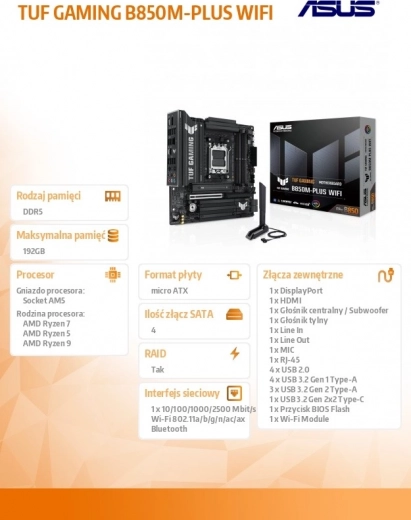 Het ASUS TUF Gaming B850M-PLUS WiFi moederbord combineert een duurzame constructie met componenten van militaire kwaliteit, versterkte stroomvoorziening en geavanceerde koeling voor stabiele prestaties. Het biedt moderne connectiviteit, ondersteuning voor de nieuwste AMD Ryzen-processors en instellingen die klaar zijn voor intensief gamen en AI-toepassingen.