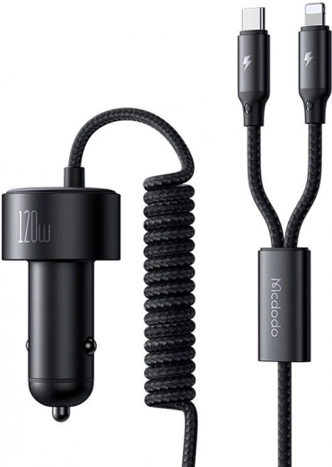 Geniet van maximaal gemak en prestaties onderweg. Macdodo brengt een compacte autolader met geïntegreerde USB‑C- en Lightning‑kabels die telefoons, tablets en laptops kan voeden. Dankzij ondersteuning voor snellaadprotocollen en een vermogen tot 120 W levert hij energie snel en veilig.