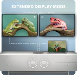 De hub biedt twee USB‑A 5Gbps‑poorten en één USB‑C 5Gbps‑poort voor data, kan continu meerdere externe schijven bedienen en ondersteunt opladen van telefoons en tablets tot 1,5 A/5 V. Het dubbele HDMI‑uitgangspaar levert beeld tot 4K/60 Hz (ook 2K/120–144 Hz en 1080p/240 Hz ondersteund), inclusief HDR en meerkanaals audio. De metalen behuizing zorgt voor duurzaamheid en efficiënte warmteafvoer.
