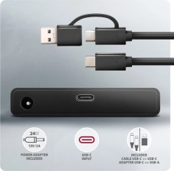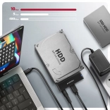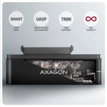 Voor 3.5" schijven zit er een AC/DC voeding 12V/2A (24 W) in de doos, terwijl 2.5" SSD/HDD’s comfortabel via USB‑voeding werken. De adapter ondersteunt moderne technologieën voor lange levensduur en betrouwbaarheid: UASP voor snellere overdracht, TRIM voor behoud van SSD‑prestaties, S.M.A.R.T. monitoring, de mogelijkheid om te booten vanaf de aangesloten schijf, Auto Spindown en Turn Off. Het matte oppervlak is bestand tegen vingerafdrukken en dankzij de compacte afmetingen heb je de adapter altijd bij de hand.