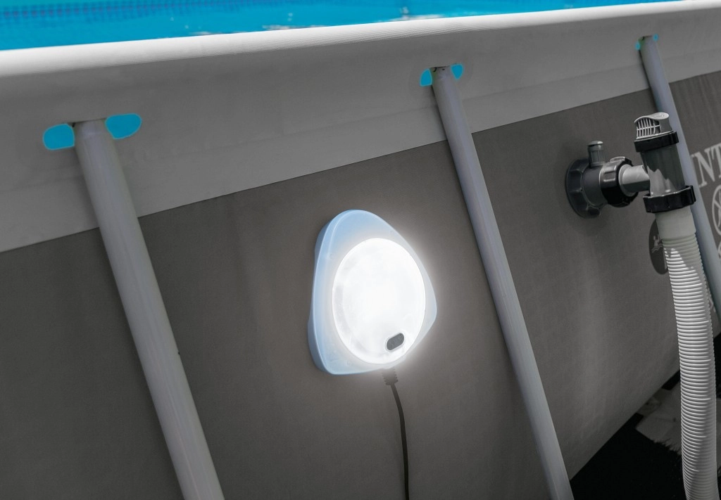 De magnetische LED-lamp van INTEX is een slimme en veilige oplossing voor nachtelijk zwemmen en tuinfeesten. Twee verbonden delen worden aan beide zijden van de wand bevestigd met sterke magneten – het binnendeel verlicht het water, het buitendeel zorgt voor aangenaam omgevingslicht rondom. Dankzij de inductieve voeding is gevaarlijk contact van elektriciteit met water uitgesloten.