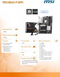 De MSI PRO B840-P WIFI valt op door een strak ontwerp in harmonieuze zilver‑zwarte kleuren dat perfect past in zowel witte als zwarte builds. De krachtige voedingssectie Direct 7+2+1, 6‑laagse PCB met 2oz koper en Core Boost en Memory Boost bieden stabiliteit en hoge prestaties voor moderne AMD Ryzen-processors.