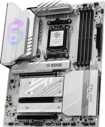 MPG B850 EDGE TI WIFI is een krachtige moederbord in een elegant zilver-wit design met geavanceerde functies zoals Wi-Fi 7, 5G LAN en PCIe 5.0, ideaal voor AMD Ryzen processoren van de 9000-serie.
