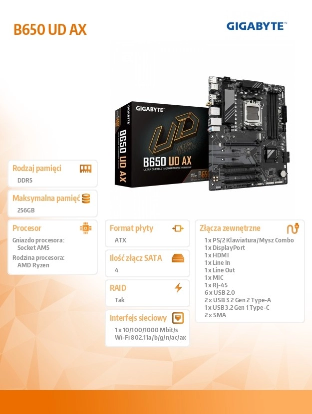 Bouw een krachtige en toekomstbestendige pc op het AM5-platform. De GIGABYTE B650 UD AX combineert een 6+2+2‑fasig digitaal VRM voor stabiele CPU-voeding met ondersteuning voor dual‑channel DDR5‑geheugen (EXPO/XMP), zodat je het maximale uit de nieuwste AMD Ryzen 7000/8000/9000‑processors haalt. Dankzij de M.2‑slots (1× PCIe 5.0 en 2× PCIe 4.0) profiteer je van extreem snelle systeem- en app‑laadtijden.