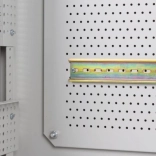 - Geperforeerde achterplaat (mesh), DIN‑rail, ankerset, aardingsdraad, M6/M4‑schroeven