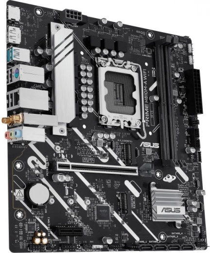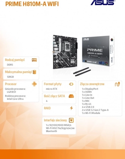 Het PRIME H810M-A WiFi moederbord is een ideale keuze voor elke mATX-behuizing dankzij de afmetingen van 24,4 x 22,2 cm, wat zorgt voor optimale ruimtebenutting. Het kernonderdeel is de LGA1851-socket, die processors uit de Intel Core Ultra-familie ondersteunt, zodat je kunt genieten van uitzonderlijke kracht en snelheid van je pc.