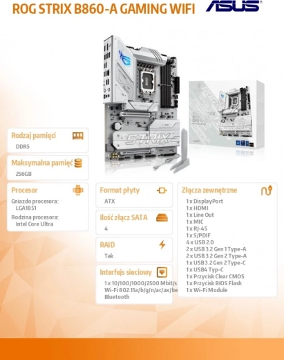 Het Asus ROG Strix B860-A Gaming WiFi-moederbord is ontworpen voor wie prestaties en stabiliteit zoekt. Dankzij de ondersteuning voor Intel Core Ultra-processors en het LGA1851-socket levert het onovertroffen prestaties, zelfs bij de zwaarste taken.