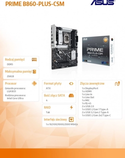 Bouw een modern pc-systeem op het Intel-platform met het Asus Prime B860-PLUS-CSM bord. De stabiele Intel B860 chipset zorgt voor betrouwbare werking en efficiënte hardwarebenutting, terwijl de LGA1851 socket de deur opent naar de nieuwste Intel Core Ultra processors.