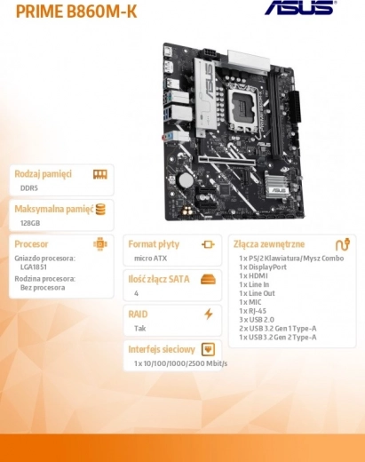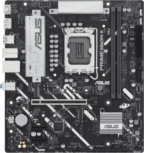 Compact mATX moederbord ASUS PRIME B860M-K met socket LGA1851 en ondersteuning voor DDR5 biedt een snelle, stabiele en moderne basis voor je pc. Biedt PCIe 4.0 voor grafische kaarten en uitbreidingen, twee M.2-slots, vier SATA 6 Gb/s, RAID-ondersteuning en tot 128 GB RAM met frequenties tot 8800 MHz voor soepele prestaties, zelfs bij veeleisende taken.