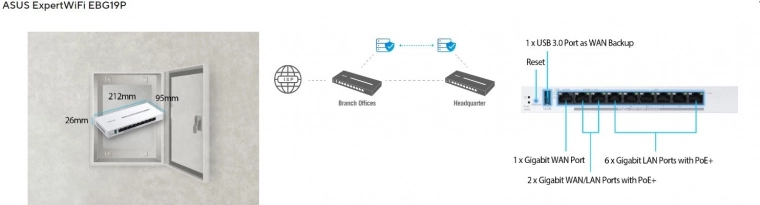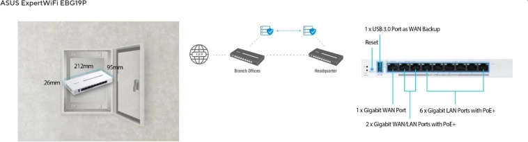 De ASUS ExpertWiFi EBG19P is een krachtige zakelijke router die is ontworpen voor een stabiel en veilig netwerk. Negen gigabitpoorten, inclusief een toegewezen WAN en meerdere LAN’s, bieden hoge doorvoer en eenvoudige segmentatie van het netwerk. Dankzij de ondersteuning voor PoE+ voorzie je IP‑camera’s, access points of VoIP‑telefoons rechtstreeks via de poorten van stroom, zonder extra voedingsadapters.