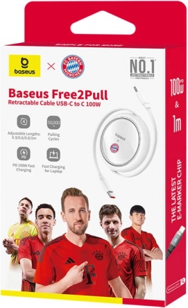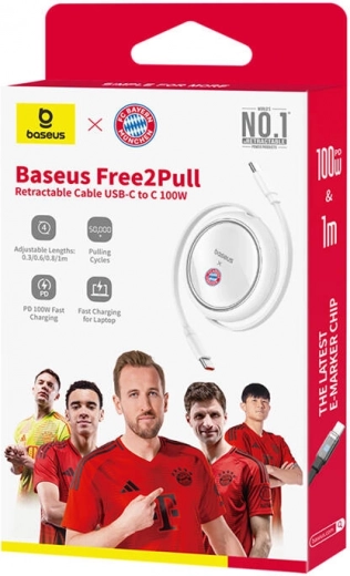 De stijlvolle uittrekbare kabel Baseus Free2Pull met USB‑C naar USB‑C biedt snelladen van 100 W, verstelbare lengte (35/60/83/100 cm) en een compact design voor gemakkelijk meenemen. Dankzij stabiele spanning en bescherming tegen oververhitting is het laden veilig, terwijl de editie met het FC Bayern München-logo je apparaat een premium sportieve look geeft.