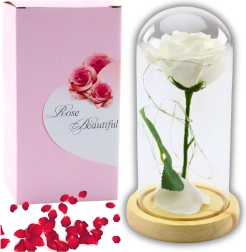 Eeuwige witte roos onder glazen koepel met LED-verlichting is het ideale cadeau voor wie elegantie en symboliek waardeert. Deze kunstroos, die een natuurlijke bloem perfect nabootst, verwelkt nooit en ziet er altijd fris uit. Onder een glazen koepel en verlicht door zacht LED-licht, creëert zij een