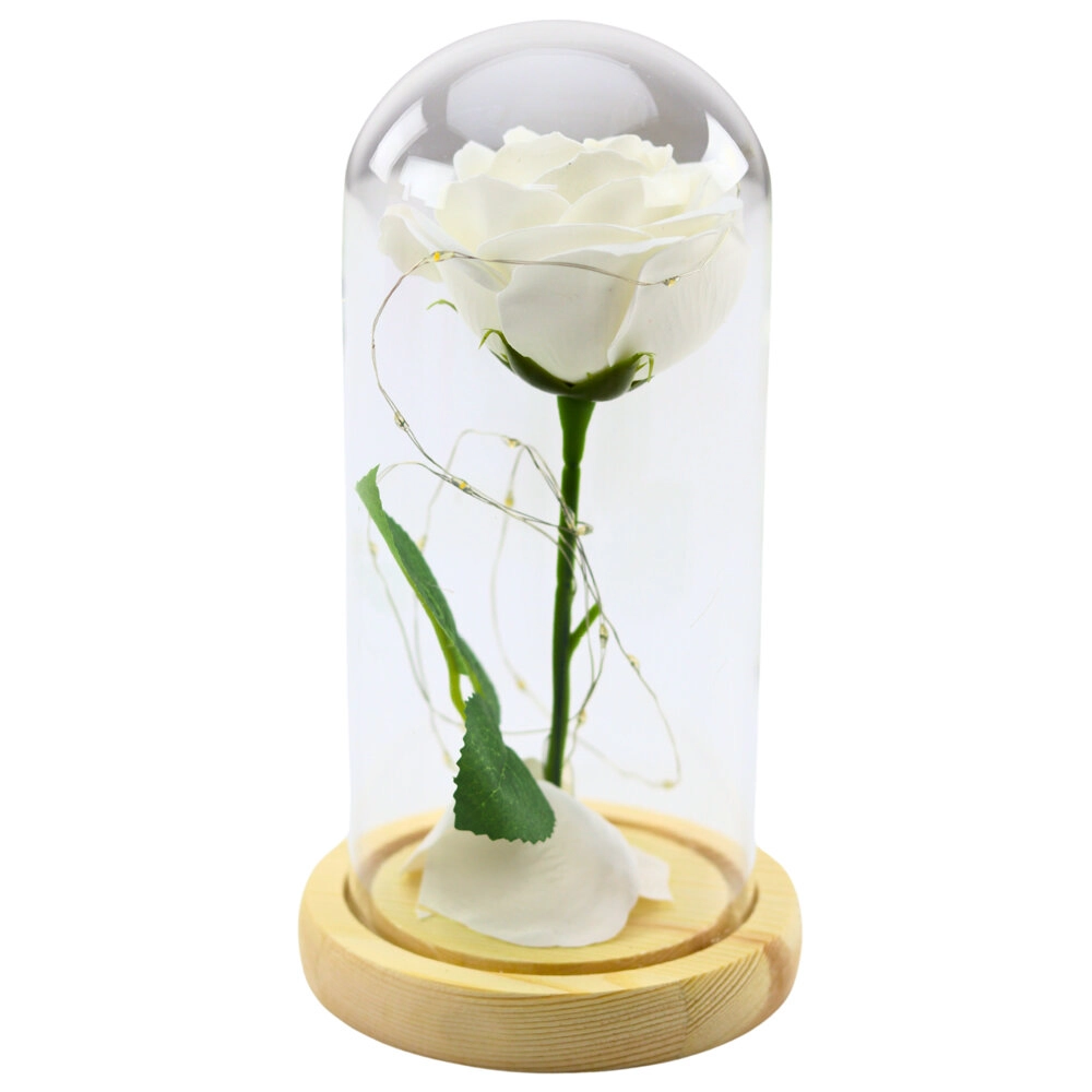 - LED-verlichting – Zacht licht benadrukt de schoonheid van de roos en creëert een warme, romantische sfeer.