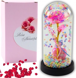 De eeuwige roos in koepel is een symbool van blijvende liefde en een elegante eyecatcher die meteen betovert. Warm LED-licht benadrukt haar schoonheid en geeft de ruimte een aangename, romantische sfeer – perfect voor jubilea, Valentijnsdag, verjaardagen en als trouwdecoratie.
