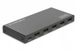 De DIGITUS HDMI-splitter dupliceert het audio-videosignaal van één bron naar vier uitgangen in maximale kwaliteit 4K bij 60 Hz (4:4:4). Dankzij EDID-beheer (Auto / Copy / Downscaler) herkent hij automatisch aangesloten displays of past hij parameters aan voor probleemloze weergave op verschillende monitoren tegelijk.