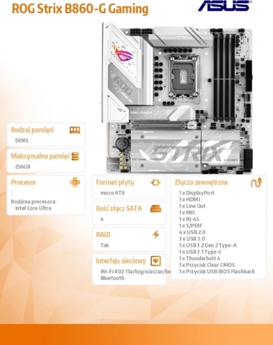 Het ROG Strix B860-G Gaming WiFi moederbord biedt Thunderbolt 4, PCIe 5.0, moderne DDR5-geheugenondersteuning en Wi‑Fi 7 voor razendsnelle gegevensoverdracht, topconnectiviteit en stijlvolle Aura Sync RGB. Ontworpen voor elite gaming én AI-toepassingen, met stabiele prestaties, eenvoudige tuning en slimme ASUS AI-functies voor maximale snelheid en betrouwbaarheid.