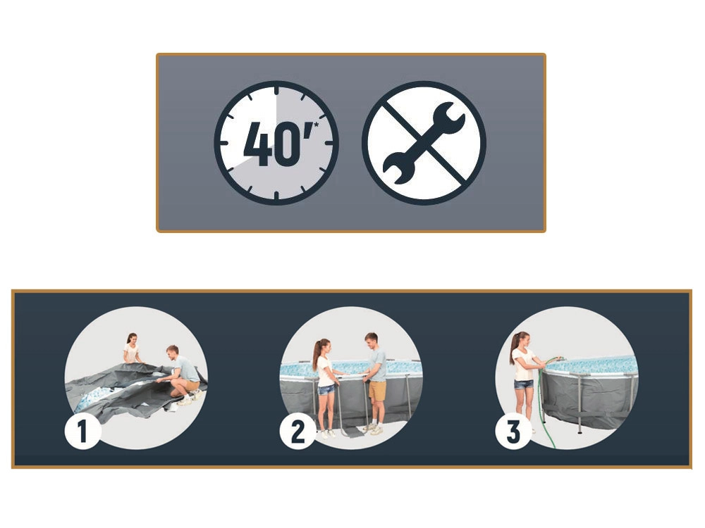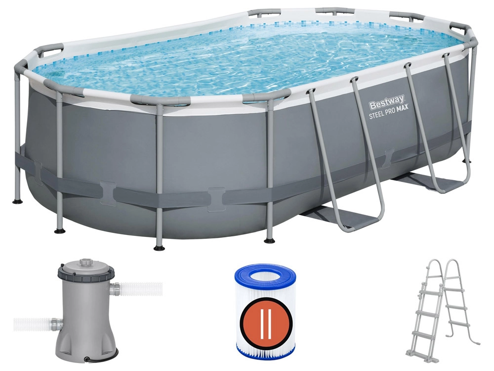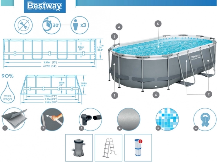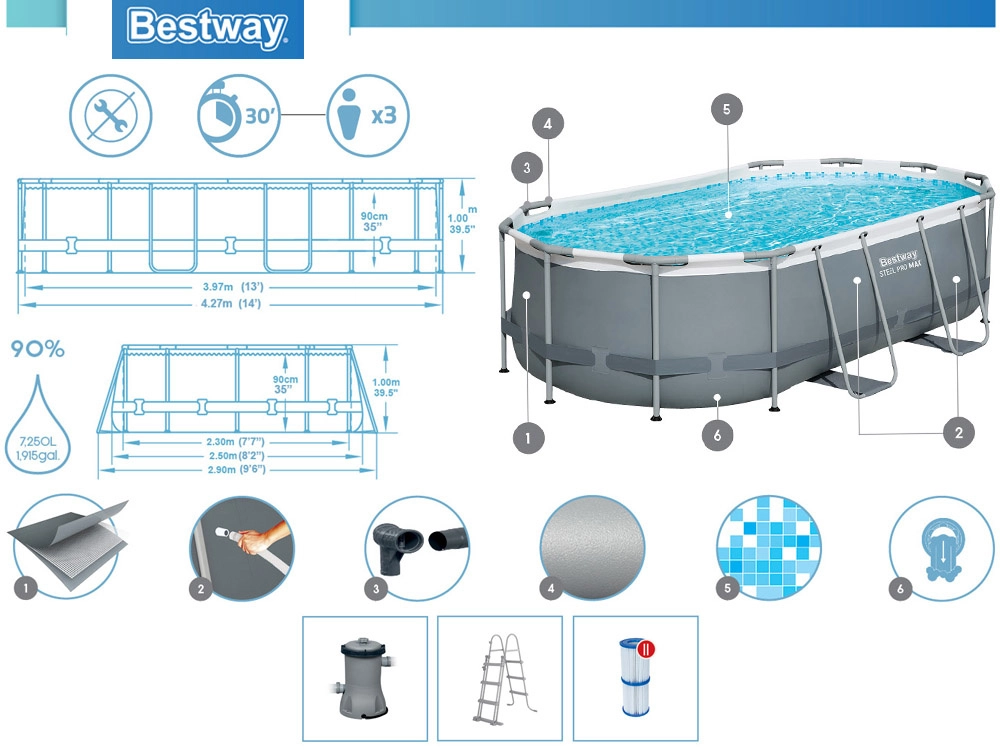 Het zwembad wordt geleverd inclusief filterpomp met een capaciteit van 2.006 l/u, chemische doseerder, slangen, zeefjes, klemmen, veiligheidsladder, reparatiepatch en gebruiksaanwijzing.