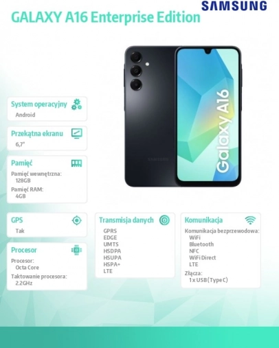 Stijlvolle en betrouwbare smartphone Galaxy A16 LTE in de Enterprise Edition biedt 4 GB RAM en 128 GB opslag, praktische prestaties voor werk en entertainment en langdurige software-ondersteuning. In een elegante zwarte kleur en met zakelijke tools voor eenvoudig beheer is het een ideale keuze voor dagelijks gebruik en voor de bedrijfsomgeving.