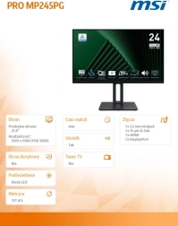 De MSI PRO MP245PG is een veelzijdige 23,8" IPS-monitor ontworpen voor productiviteit en comfort. Dankzij de Full HD-resolutie en een verversingssnelheid van 100 Hz krijg je vloeiend scrollen, betere leesbaarheid en snellere respons bij dagelijks werk en licht gamen. De dunne randen bevorderen multitasking met meerdere schermen.