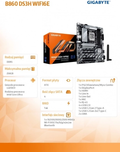 Bouw een krachtige en betrouwbare pc met het Gigabyte B860 DS3H WIFI 6E moederbord. Het biedt ondersteuning voor Intel Core Ultra-processors (2e generatie), een hybride VRM 8+1+2 voor stabiele voeding, ultrasnelle opslag met 2× M.2 (1× PCIe 5.0 x4) en snelle connectiviteit met 2.5 GbE + Wi‑Fi 6E. Dankzij AI PerfDrive, EZ-Latch en WIFI EZ‑Plug verlopen zowel de bouw als het afstellen van het systeem snel, eenvoudig en efficiënt.