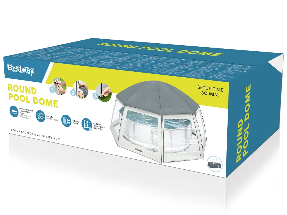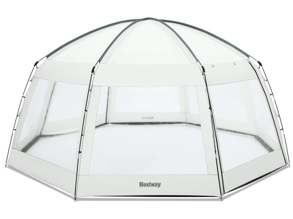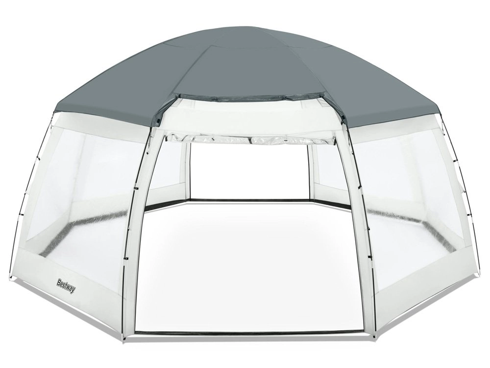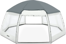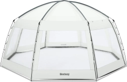 Het praktische BESTWAY 2-in-1 paviljoen verandert je tuin in een oase van rust – het dient zowel als afdekking voor opzetzwembaden als tuinpaviljoen. Dankzij de slijtvaste polyesterstof met coating is het waterdicht, beschermt het tegen zon (UPF 50+), regen en insecten, en helpt het bovendien afkoeling van het water te beperken in het zwembad. De ruime koepel met transparante ramen biedt licht, uitzicht en comfortabel gebruik bij elk weertype.