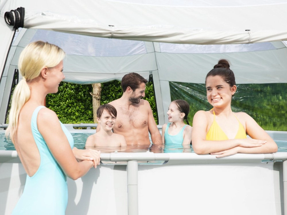 Dankzij de royale afmetingen is het paviljoen ook geschikt voor grotere opzetzwembaden – het biedt comfortabele bewegingsruimte, eenvoudig gebruik van de zwembadladder en dient tevens als tuinpaviljoen voor familiegezelligheid. Snelle montage in ongeveer 30 minuten en een transporttas maken seizoensgebonden gebruik gemakkelijk.