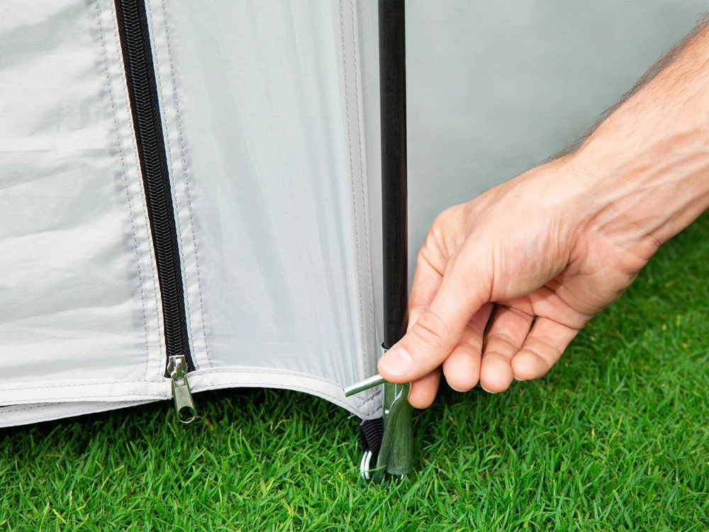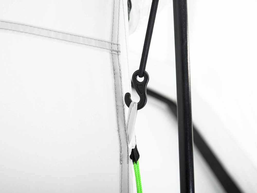 Glasvezelstokken, scheerlijnen en haringen maken montage in ongeveer 30 minuten mogelijk. Een praktische tas vergemakkelijkt het dragen en opbergen.