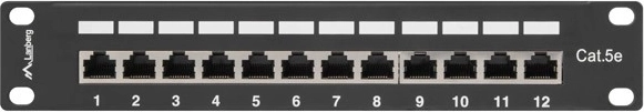Professioneel patchpanel met 12 afgeschermde RJ‑45‑poorten in categorie 5e voor een 10" rack, biedt betrouwbare terminatie en organisatie van bekabeling. Ondersteunt T568A/B‑standaarden, heeft duidelijke poortnummering en een hoogte van 1U voor eenvoudige integratie in distributiepunten.