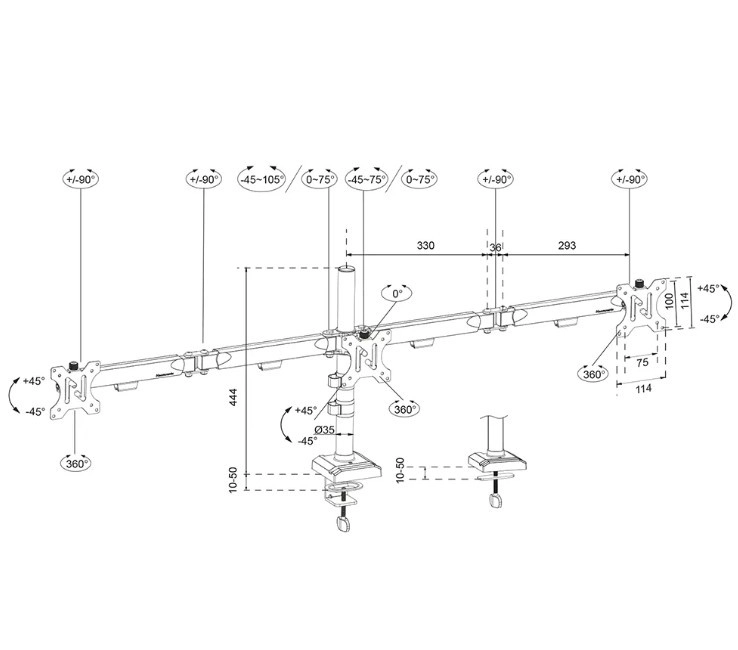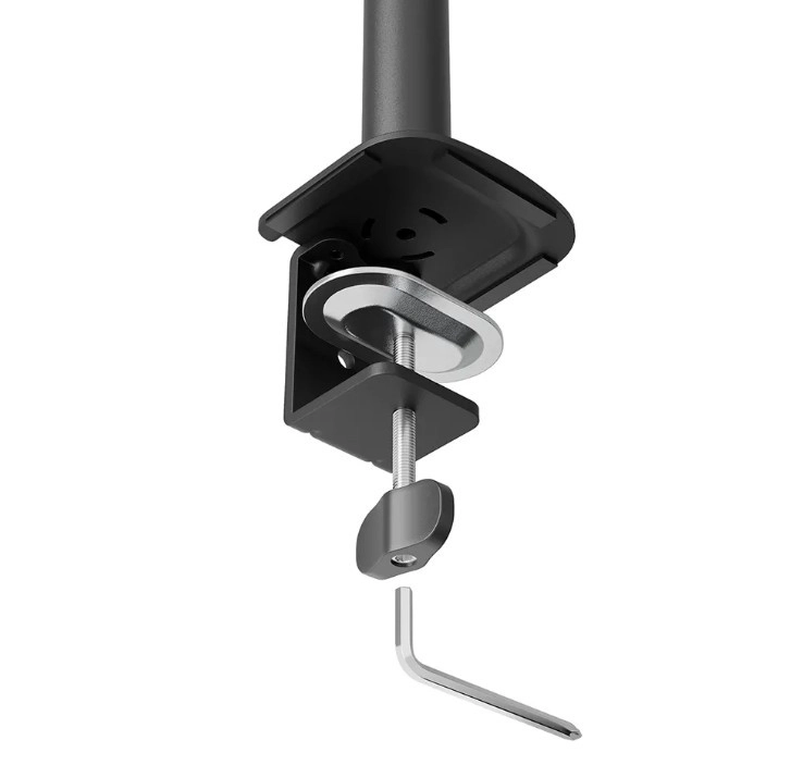 De houder is uitgerust met een 180°-stopmechanisme voor veilige plaatsing dicht bij muren en een stevige, gelaste basis voor maximale stabiliteit. Bovendien houdt het ingebouwde kabelbeheer het bureau geordend en schoon, met extra ruimte voor je telefoon.