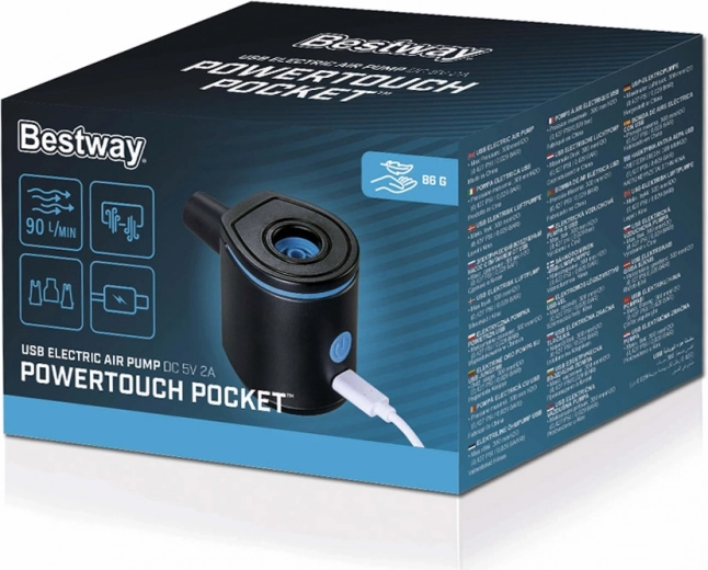 Zoek je een kleine maar krachtige pomp die je overal mee naartoe neemt? BESTWAY POWERTOUCH POCKET USB past in je zak, rugzak of reistas. Hij wordt gevoed via USB, waardoor je hem eenvoudig aansluit op een oplader, powerbank of in de auto en in een mum van tijd alles opblaast wat je nodig hebt.