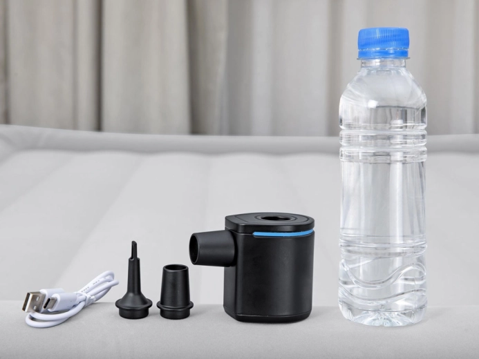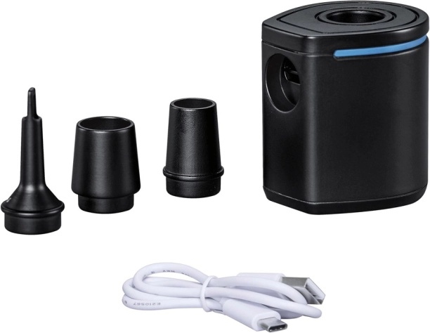 Dankzij de luchtstroom van 90 l/min kan de pomp snel opblazen en leegzuigen. De bediening is intuïtief – je hebt slechts één knop nodig. Met drie opzetstukken past hij op de meeste gangbare ventielen van luchtmatrassen, zwemringen, ligbedden en kampeermatten.