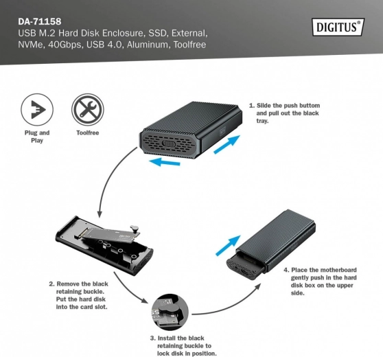 De behuizing ondersteunt M.2-moduleformaten 2230, 2242, 2260 en 2280, wat compatibiliteit met een breed scala aan SSD’s waarborgt.
