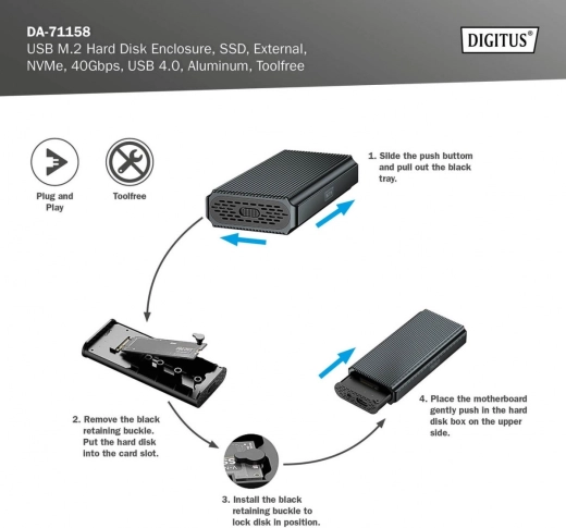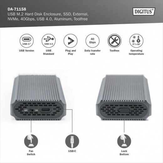 De schijfbehuizing biedt hoge compatibiliteit met M.2-modules in diverse formaten (2230, 2242, 2260 en 2280) en een maximale capaciteit van 8 TB, waardoor er voldoende ruimte is voor al uw bestanden en data. Dankzij USB 4.0-technologie wordt een snelle gegevensoverdracht tot 40 Gb/s gegarandeerd, wat zorgt voor soepel werken en efficiënte bestandoverdracht.