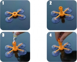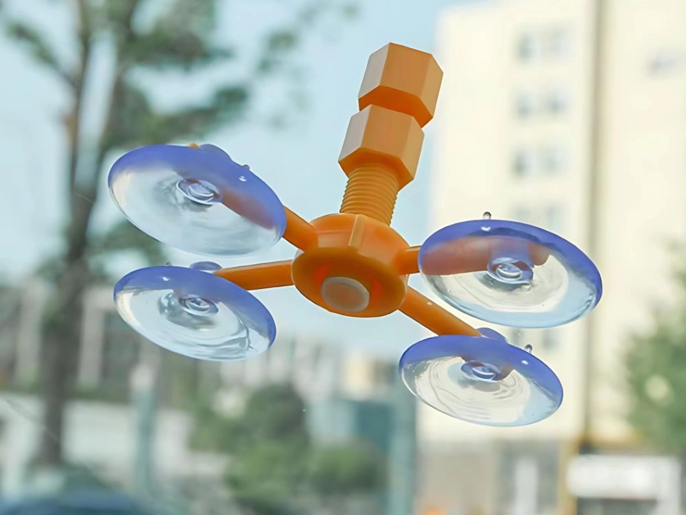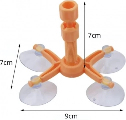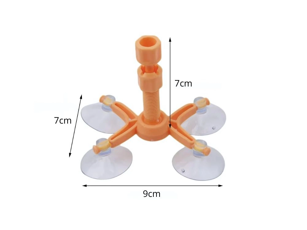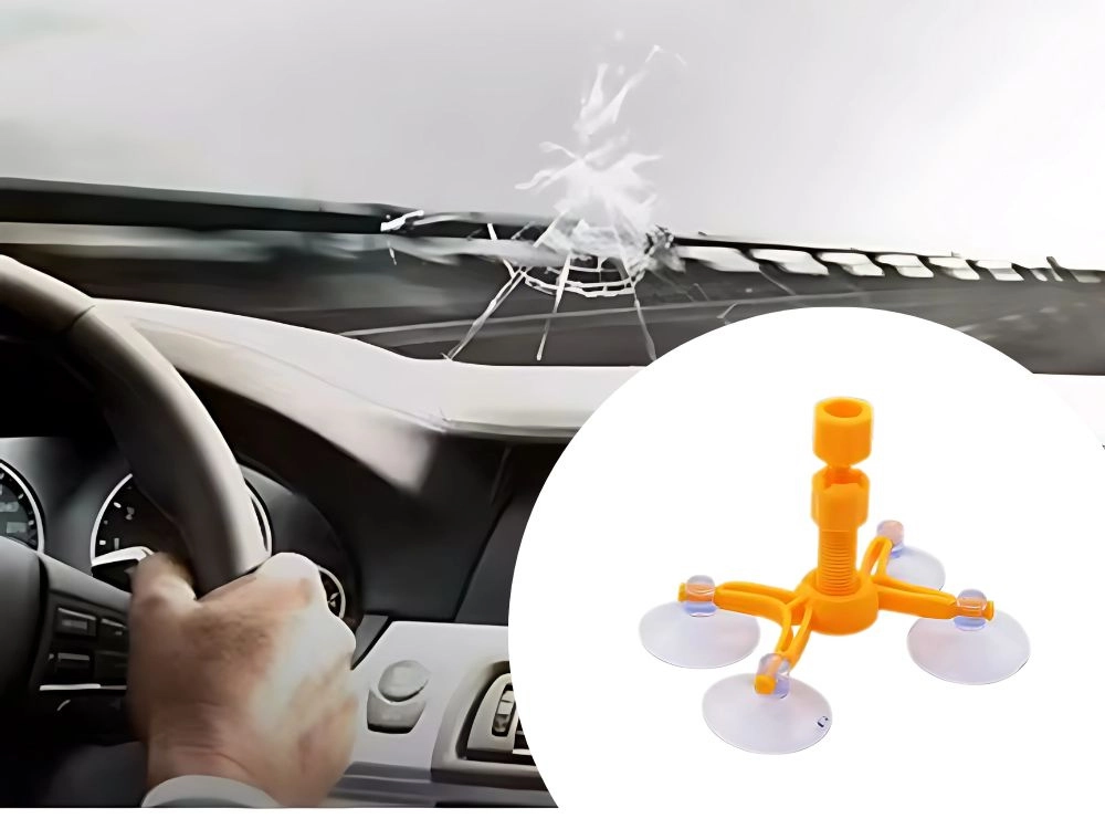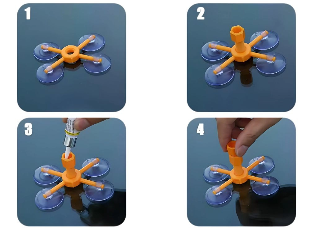 De oranje houder met vier zuignappen hecht stevig op het glas en centreert de injector precies boven de beschadiging, zodat de hars de scheur nauwkeurig vult zonder te verschuiven.