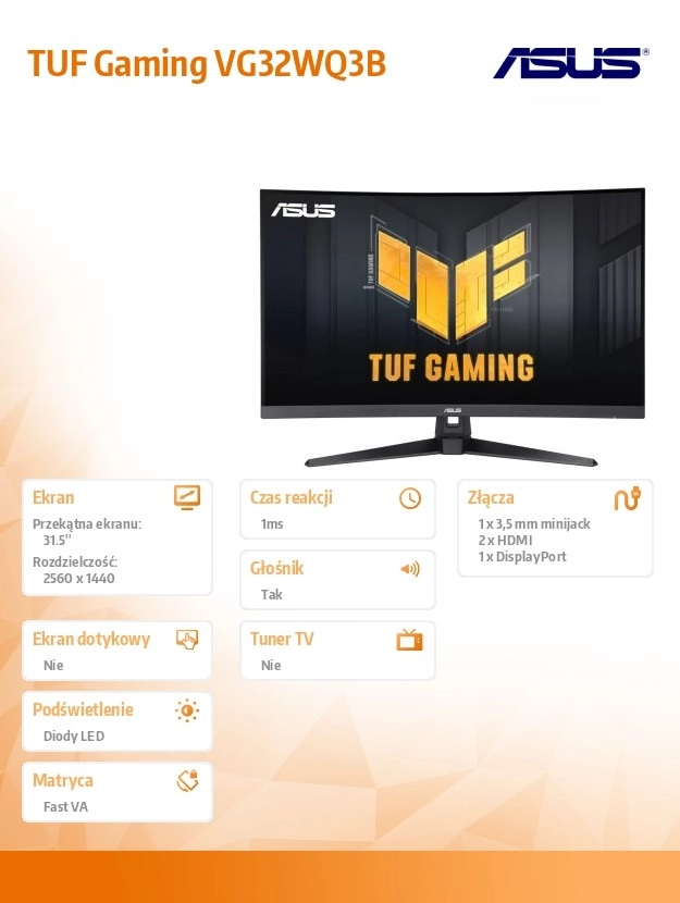 De ASUS TUF Gaming VG32WQ3B is een 31,5″ gebogen gamingmonitor, ontworpen voor gamers die vloeiendheid en precisie eisen. De hoge verversingssnelheid en lage responstijd zorgen voor snelle reacties in games, terwijl de kromming van het scherm voor extra immersie zorgt. Dankzij de ondersteuning van moderne synchronisatietechnologieën worden tearing en inputvertraging geminimaliseerd.