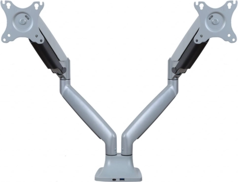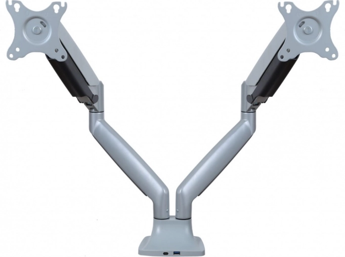 Dubbele gasveerarm voor 2 monitoren biedt professionele ergonomie en uitzonderlijk draagvermogen van 1–15 kg per monitor. Ondersteunt ultrawide en gebogen schermen, VESA 75×75 en 100×100 standaarden en maakt kantelen −15°/+15°, draaien ±90° en pivot naar portret mogelijk. In de voet vind je USB‑A 3.0 en USB‑C voor handig aansluiten direct op het bureau.