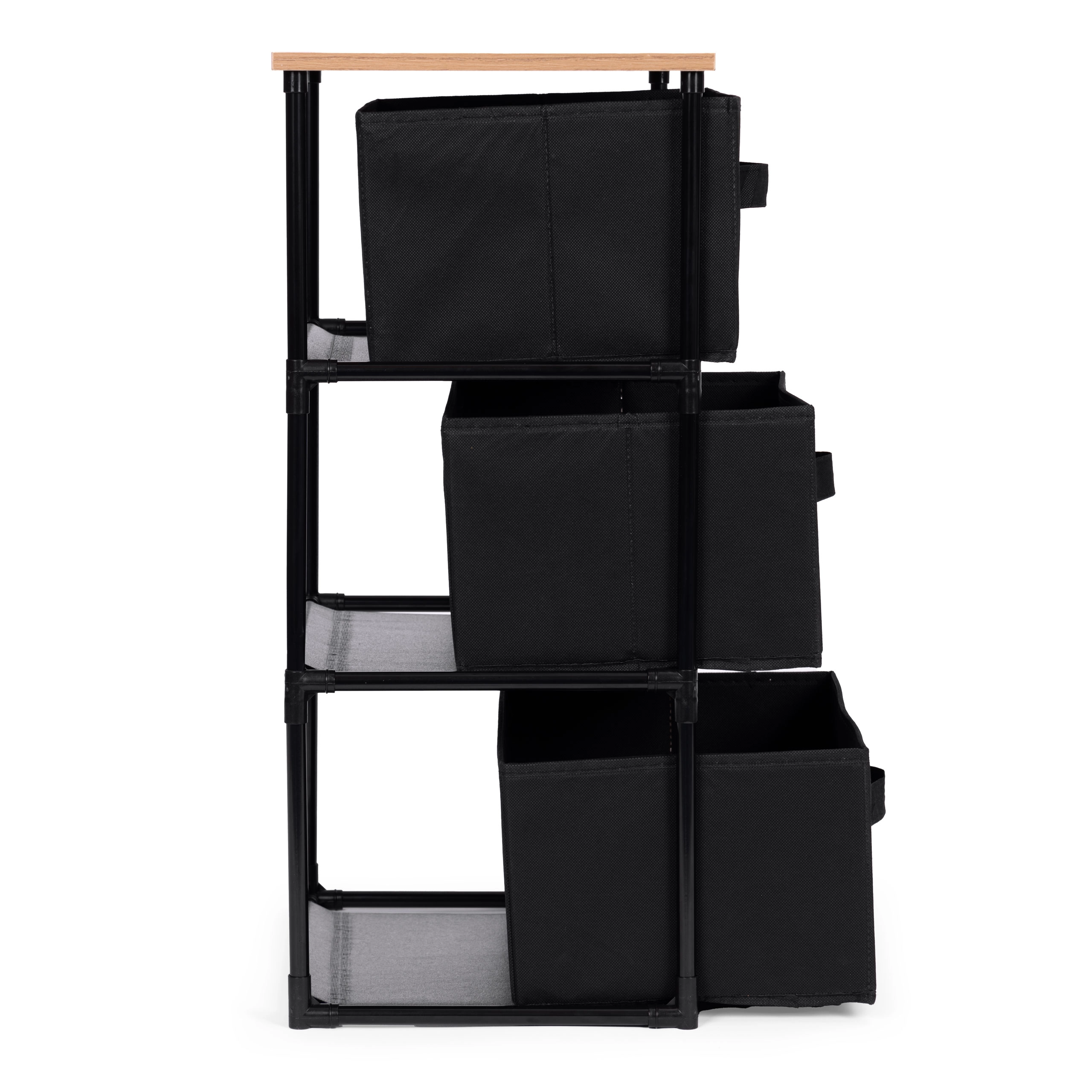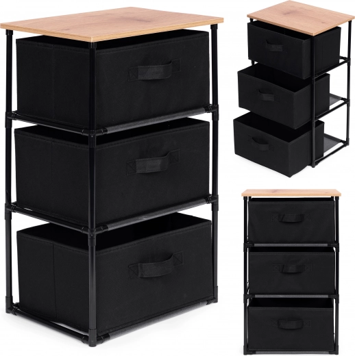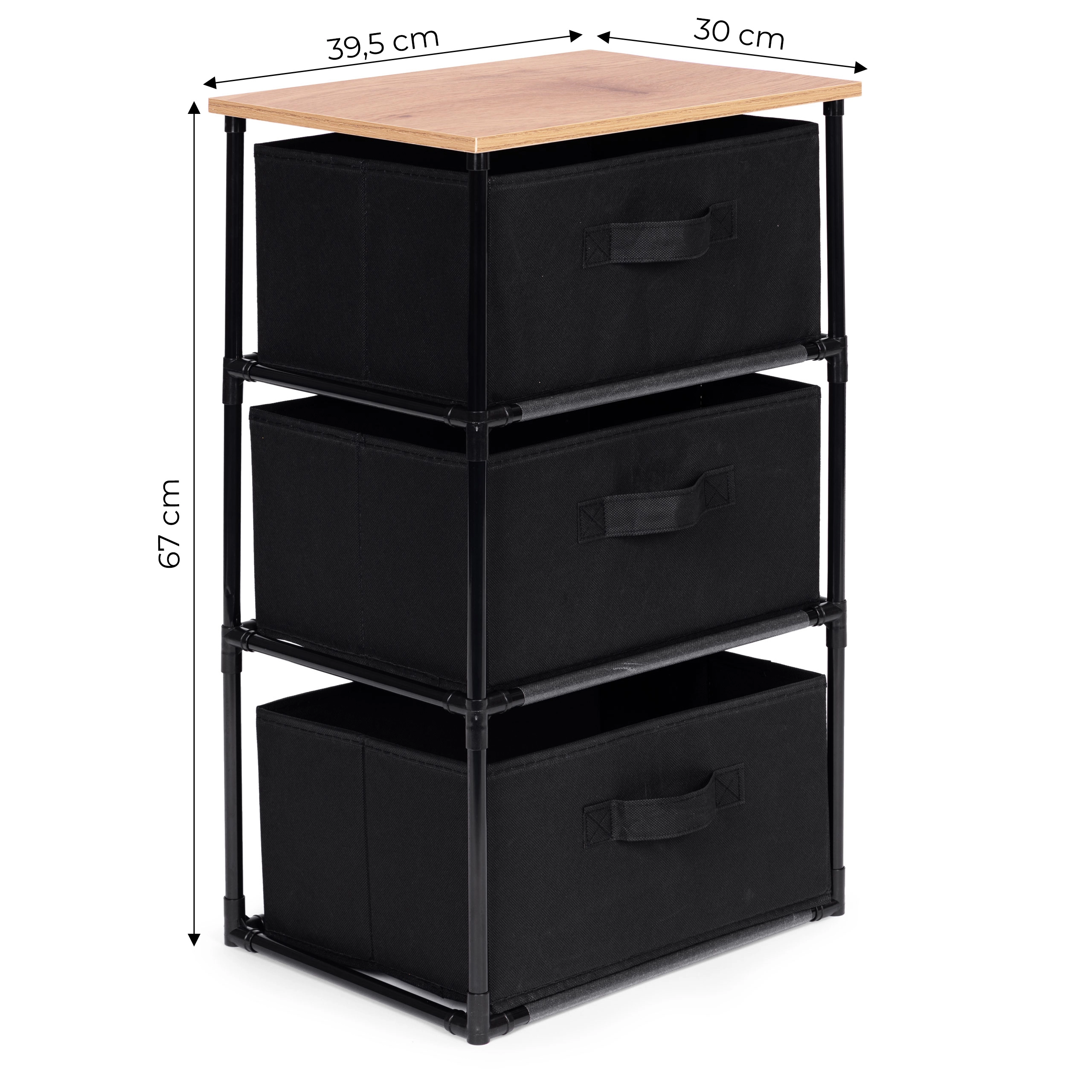 De kast bevat drie uitneembare manden van duurzaam textiel, geschikt voor het opbergen van kleding, boeken, speelgoed en andere items, met gemakkelijke toegang dankzij de praktische handgrepen.