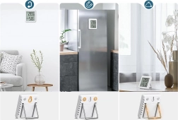 De praktische constructie maakt plaatsing op tafel mogelijk met de geïntegreerde standaard of bevestiging op metaal dankzij de magneet. De voeding gebeurt via een gangbare CR2032‑batterij (meegeleverd), zodat het apparaat direct klaar is voor gebruik.