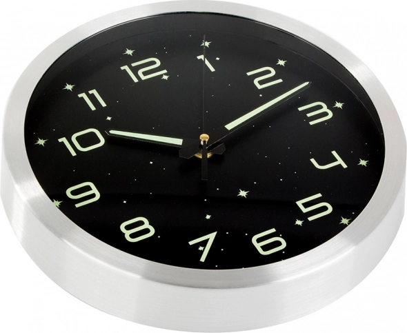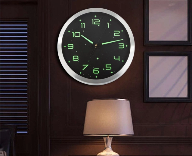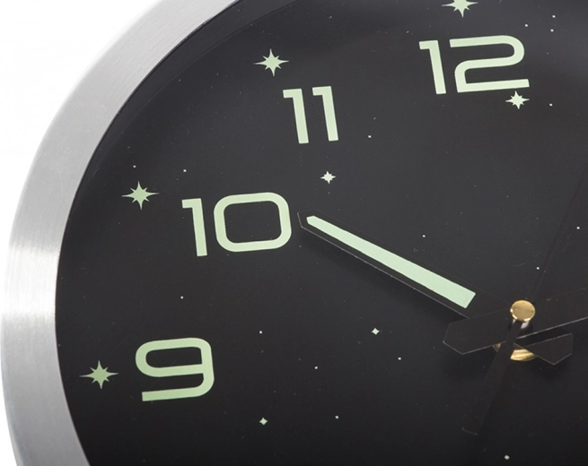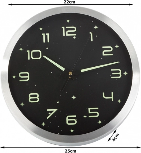 Elegante wandklok met een zwarte wijzerplaat en zilverkleurige rand, voorzien van lichtgevende cijfers, wijzers en sterretjes voor eenvoudig aflezen in het donker. Dankzij het stille, vloeiende uurwerk geschikt voor slaapkamer, kinderkamer en kantoor. Eenvoudig aan de muur te monteren en zuinig in gebruik met een AA-batterij, een praktische en stijlvolle aanvulling voor elk interieur.