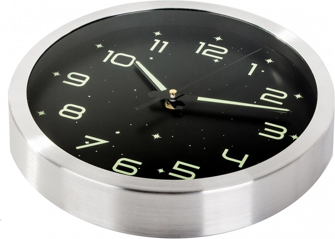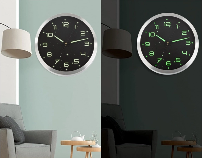 Stijlvolle wandklok in een modern design die functionaliteit en esthetiek combineert. De zwarte wijzerplaat met lichtgevende elementen zorgt voor uitstekende leesbaarheid in het donker na voorafgaande belichting, terwijl de metalen zilverkleurige rand een elegante touch geeft aan het interieur. Het stille uurwerk zonder tikken stoort niet tijdens slapen of werken.