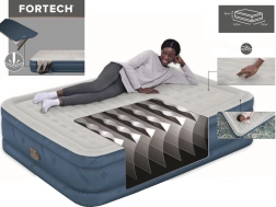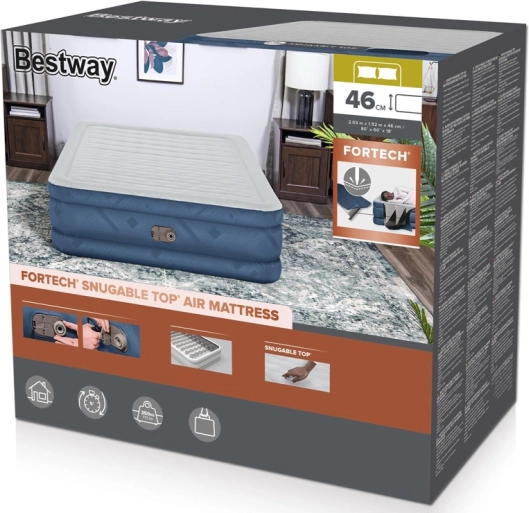 Het BESTWAY opblaasbed is gemaakt van het robuuste Tough Guard Fortech-materiaal, dat de flexibiliteit van PVC combineert met de sterkte van stof. Het zachte geflockte oppervlak is aangenaam, slipvast en verhoogt het slaapcomfort. De stabiele Wave Beam-constructie verdeelt het gewicht gelijkmatig en voorkomt doorzakken.