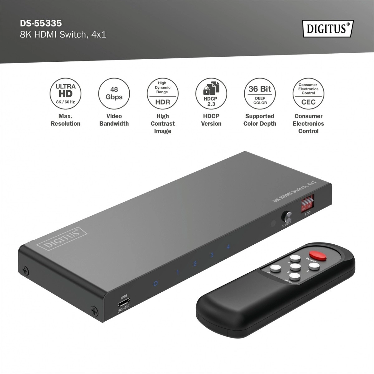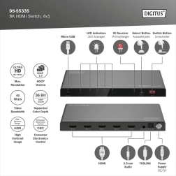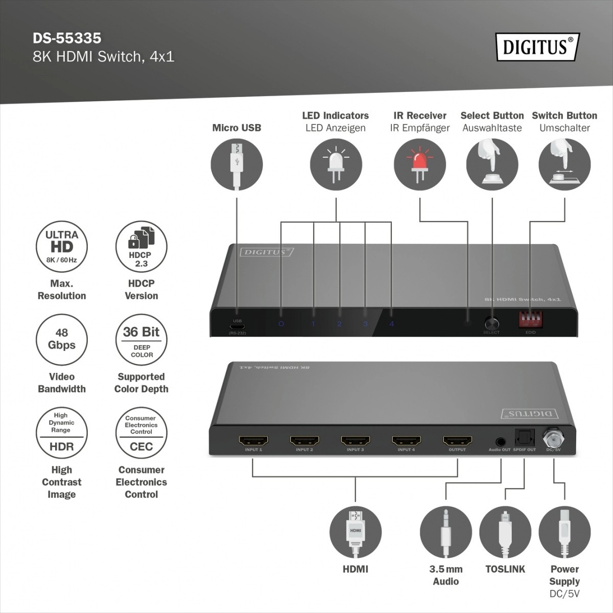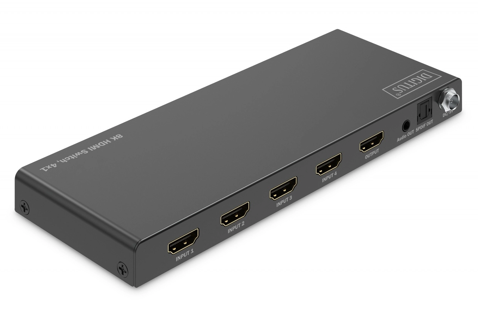 Digitus 8K HDMI-switch, 4x1 biedt vier extra HDMI-ingangen voor je monitor of tv, waardoor je eenvoudig verschillende bronnen kunt aansluiten met één HDMI-uitgang. Audiosignalen kunnen ook worden gescheiden via Toslink of de stereouitgang en apart worden afgespeeld.