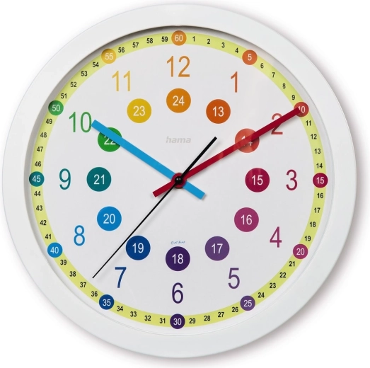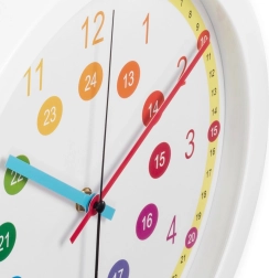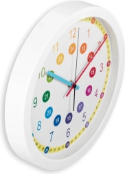 Vrolijk ontwerp voor kinderen: Deze wandklok fleurt elke kamer op en helpt kinderen spelenderwijs de tijd leren lezen.