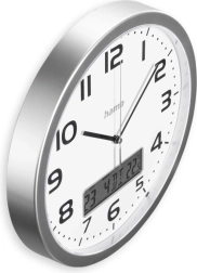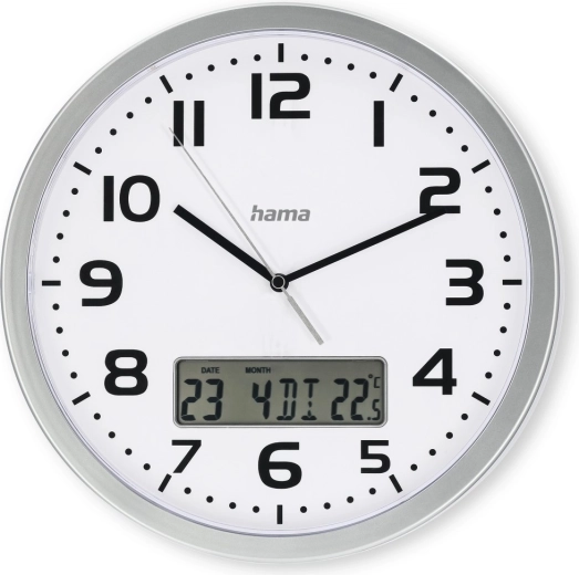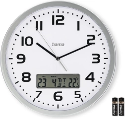 Stijlvolle wandklok met een diameter van 30 cm die traditionele analoge tijdsaanduiding combineert met een praktisch digitaal display dat de datum en de actuele kamertemperatuur toont. De DCF-radiogestuurde tijd garandeert nauwkeurigheid zonder handmatig instellen en automatisch omschakelen naar zomertijd.